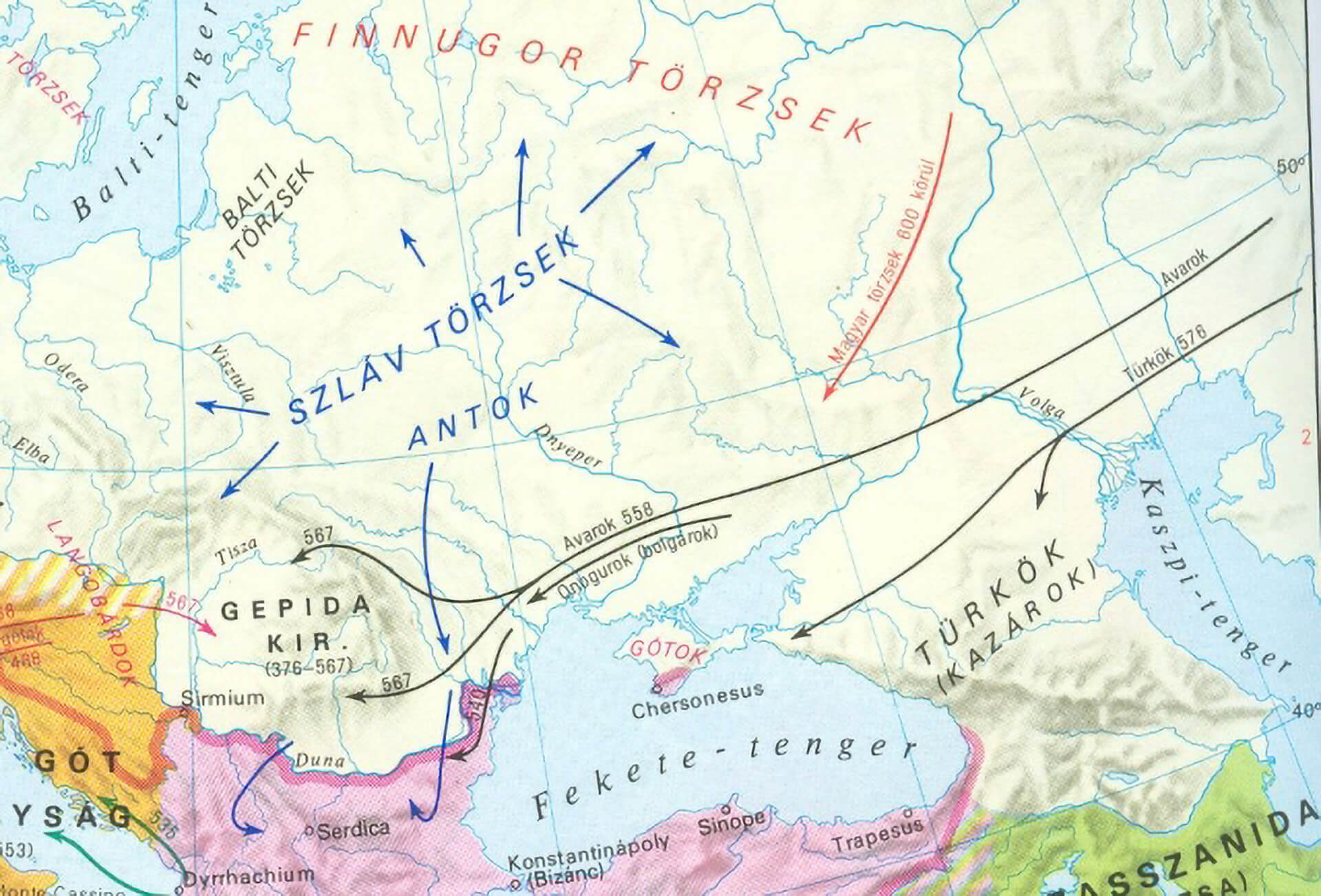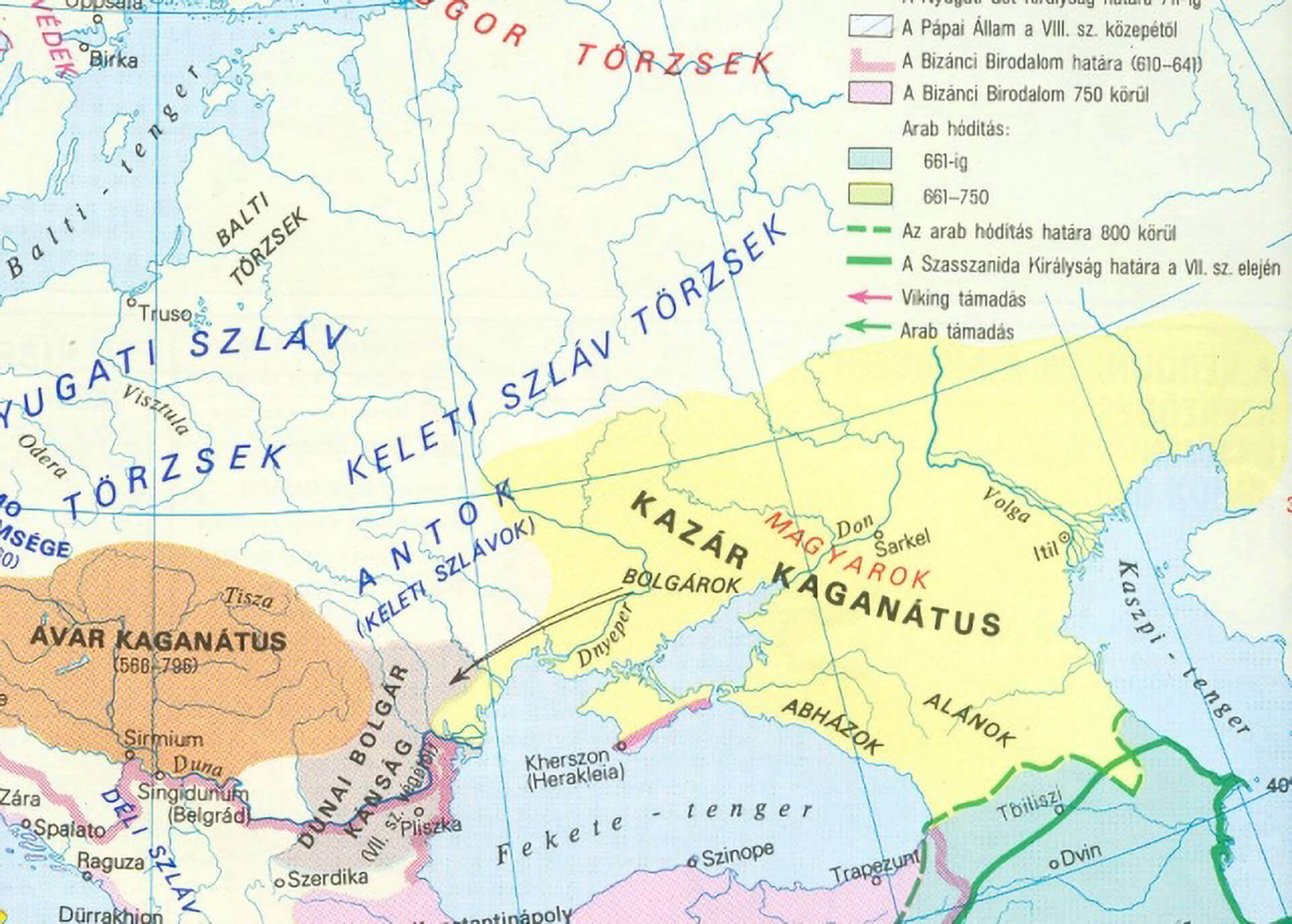 During the migration period in the 5th and 6th centuries the Magyars and the Turkic peoples arrived in this area about half a century apart only. The Turks arrived first in an area east of the Caspian Sea neighbouring Persia and also in an area between the rivers Volga and Don, which later became the Khazar Khaganate, the largest state in those days.