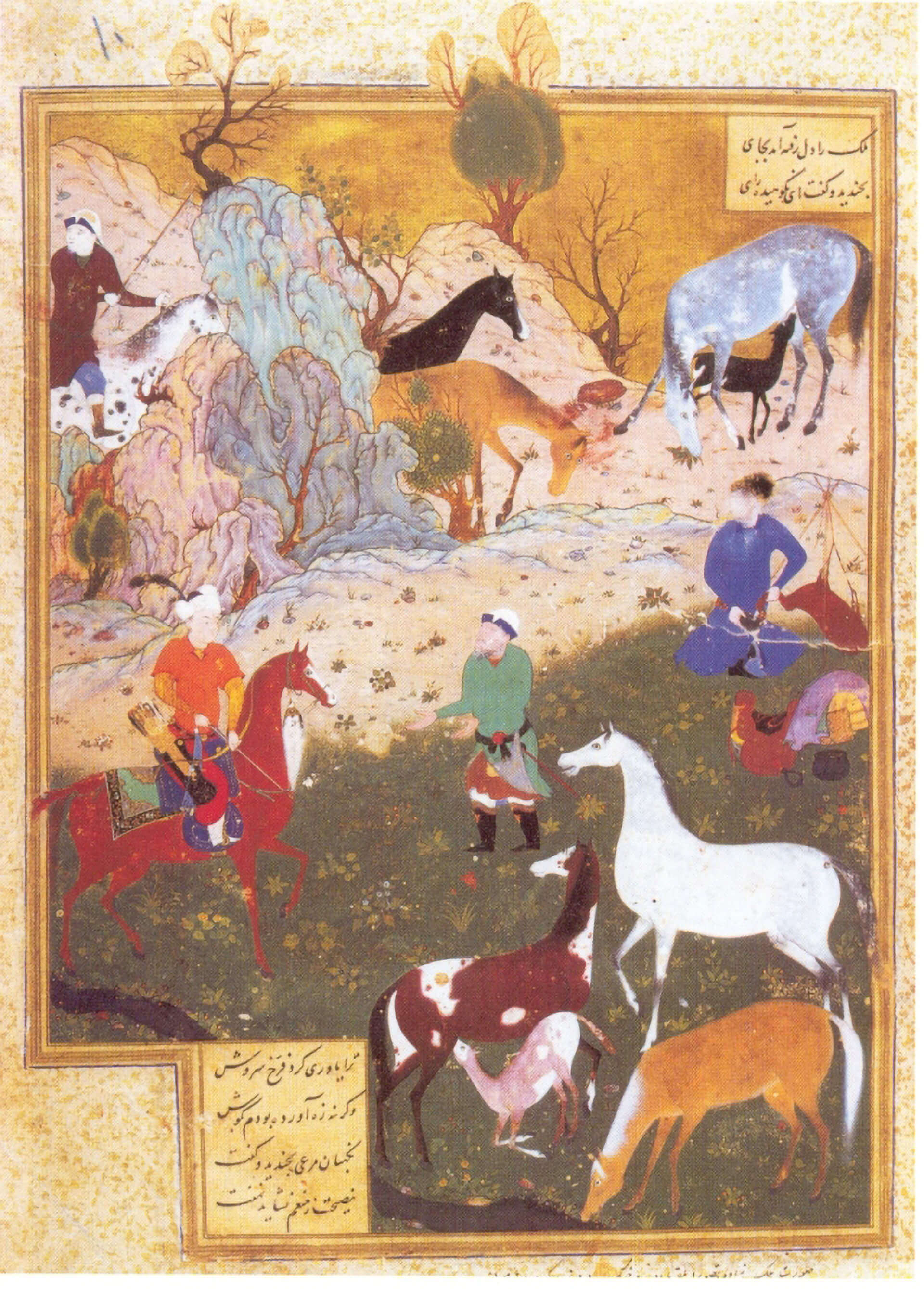 These miniatures were made in Persia probably in the 15th century. In these pictures the type and especially the colour of the horses is indicative to the fact that this breed spread over a larger area than what was inhabited by Turkmens in those days. In the third picture a Persian aristocrat is depicted during a hunting session when he meets some horse shepherds. The hats these shepherds are wearing show features characteristic to the attire that steppe nomads wore. The aristocrat is offered a drink from a cup, while at the background a white liquid, koumiss(?) is poured out of a leather bottle. To me this picture suggests that in those days nomadic Turkmens were accepted as horse keepers in that contemporary social structure and they were regarded and respected as such. I also have the additional thought that they saved this breed and helped it to survive from ancient times from which only ruins of fortifications and legends remained.